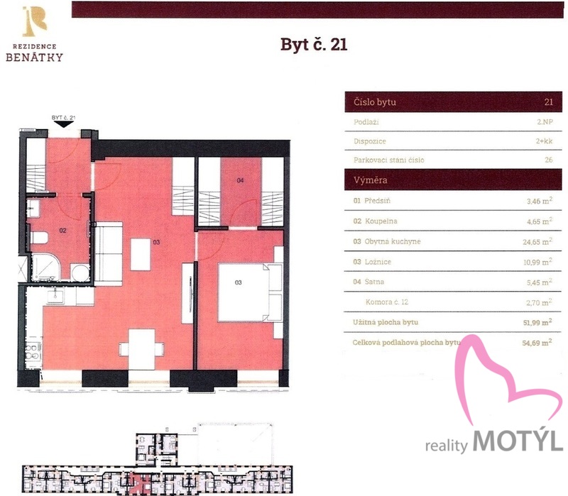Ve výhradním zastoupení majitele si vám dovoluji nabídnout tento skvostný byt, který je určen k dlouhodobému pronájmu. Byt se nachází v 1. patře v nově zrekonstruovaném objektu residence Benátky. Sestává z předsíňky, obývacího pokoje s kuchyňským koutem, ložnice, velkorysé šatny a koupelny se sprchovým koutem. K dispozici je také sklep, možnost zahrádky ve vnitrobloku. Možnost parkovacího stání za 1.000 Kč / měsíc. Měsíční nájem činí 12.000 Kč + zálohy na energie cca 5.500 Kč. Peněžitá jistota 24.000 Kč, provize 12.000 Kč. Hledáme 1–2 pohodové nájemníky. Volný od 1. 2. 2026. Vážné zájemce zveme na prohlídku. Reality s lehkostí.